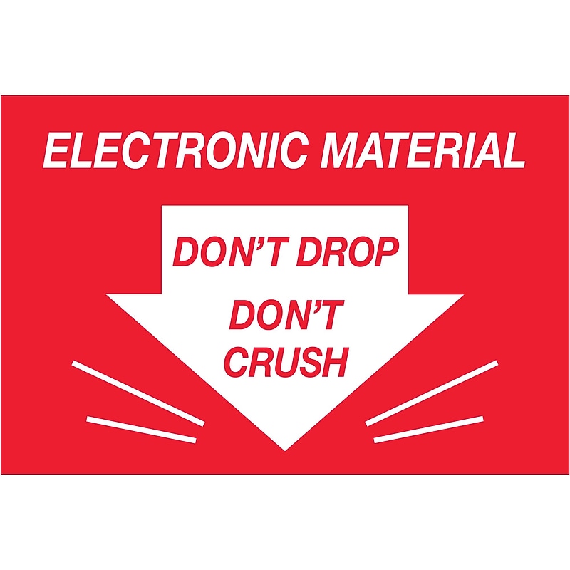 - "Don't Drop Don't Crush - Electronic Material" Labels. Boldly display instructions and warnings with pressure sensitive labels. Table top dispensers available stock numbers SL9506, SL9512 and SL9518. Wall Mount dispensers available stock numbers LDM250, LDM450, LDM850 and LDM1250. 500 per roll except 8 10 rolls which are 250 per roll. 3".Rectangle Semi-Gloss Coated Paper. 500 labels per roll. Table top dispensers available stock numbers SL9506, SL9512 and SL9518. Wall Mount dispensers available stock numbers LDM250, LDM450, LDM850 and LDM1250. DON'T DROP DON'T CRUSH labels. Boldly display instructions and warnings with pressure sensitive labels.