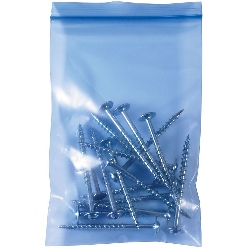3" x 5" VCI Reclosable Poly Bag. Reclosable bags provide a dust and moisture barrier in addition to a corrosion inhibitor. Low Density polyethylene film embedded with a corrosion inhibitor. No wrapping necessary! Simply place product directly into the bag. Transparent bags allow products to be identified, inventoried and picked without the need to open up the package.Low Density Polyethylene with VCI Coating. Stacked. No wrapping necessary! Simply place product directly into the bag. Transparent bags allow products to be identified, inventoried and picked without the need to open up the package. Packed 1000 per case. Use as a corrosion inhibitor. Measures 3" width by 5" length. Manufactured from blue mil poly. Reclosable bags provide a dust and moisture barrier in addition to a corrosion inhibitor.