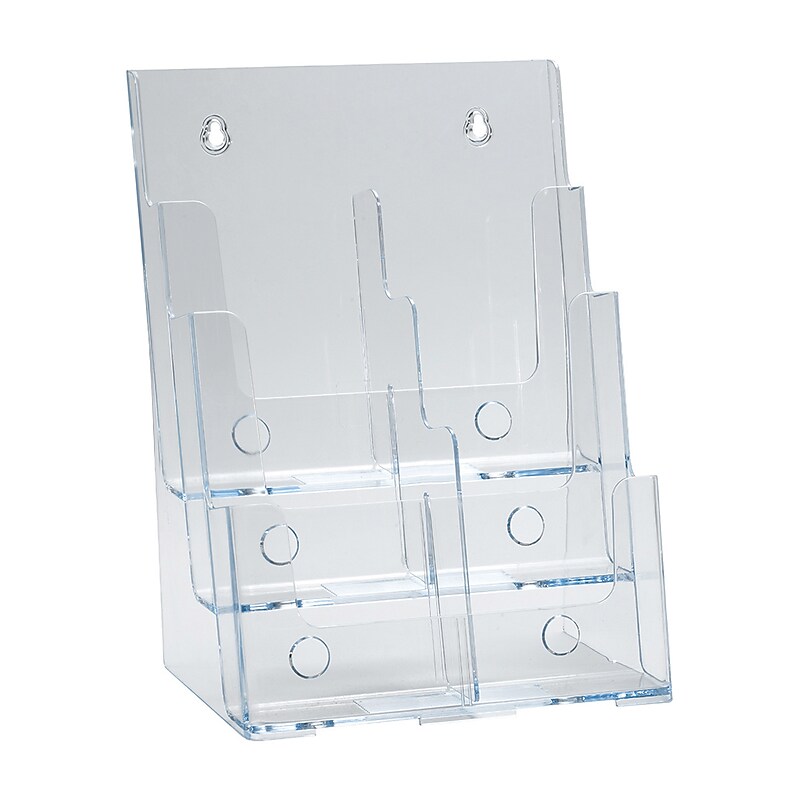 Trifold Size 6 pocket Three Tier Brochure & Literature Holder - great for booklets, or brochures. Literature holders are great tabletop displays for restaurant menus, bank signs, Hotel concierge desks, Hotel registration desks, or any company marketing material. Brochure Size: Tri-fold. Measurements: 9. 25"W 6"D 13. 25"H. Number of Pockets: 6. Material: Plastic. Color: Three-Tier Six-Pocket Trifold Brochure Holder.