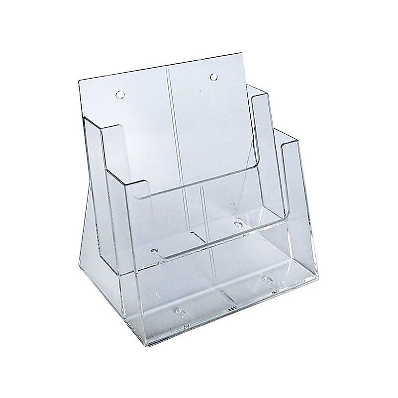 Keep tables and counters neat with this brochure holder. The two pockets make it easy to organize reading materials, while theconstruction ensures titles and subject information remain visible. This Azar brochure holder features a tiered design for convenient access to items stored inside each pocket. Desktop holder effectively displays marketing materials to clients and business associates. Clear plastic offers durability and better visibility. Top loading design with portrait orientation. Dimensions: 11. 25"H 9. 25"W 5"D. Designed to hold display literature that measures 8. 5"W 11"H. Features two pockets to organize and display your literature. Can be placed on desktops for easy viewing. Organize fliers, booklets and other reading materials in this Azar two-pocket letter-size brochure holder.