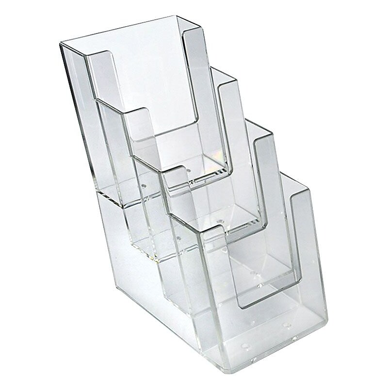 Trifold Size Four pocket Four Tier Brochure & Literature Holder - great for booklets, or brochures. Literature holders are great tabletop displays for restaurant menus, bank signs, Hotel concierge desks, Hotel registration desks, or any company marketing material. Brochure Size: Tri-fold. Measurements: 4. 25"W 6"D 10"H. Number of Pockets: 4. Material: Plastic. Color: 2/Pack. Four-Tier Four-Pocket Trifold Brochure Holder.