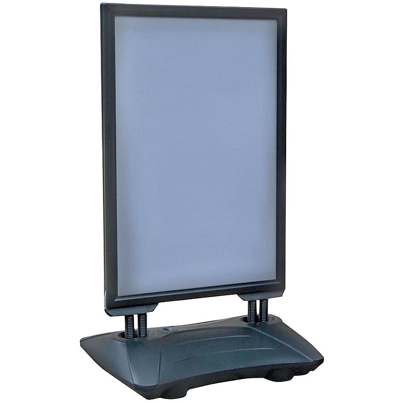 Wind-secureweighted sidwalk sign. Fill with water, and non-freezing gel (not included). This sign holds posters sized 24"W x 36"H. Sign holder is 43" H, and has an overall footprint of 26. 5"W x 33"D. Weighted Sidewalk Sign. Poster Size Measurement: 24"W x 36"H. Overall Height: 43". Material: Plastic base, Metal frameColor: Black. Color: Black. Weighted Black Sidewalk Sign.
