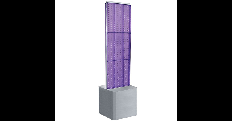 The sleek metal design of our ultramodern Studio Base will draw customer's attention to any product that is displayed. This display comes standard with a non-revolving rectangular silver metal base. See below for color panel and accessory options. Sign holder and wheels sold separately. Panel Size: 16"W x 60"H. Pegable Space: Between 44"H to 54"H. Base Size: 17"W x 14. 5"D x 16"H. Material: High Impact Styrene. Color: Two-Sided Pegboard Floor Display on Adjustable Studio Base. Panel Size: 16"W x 60"H.