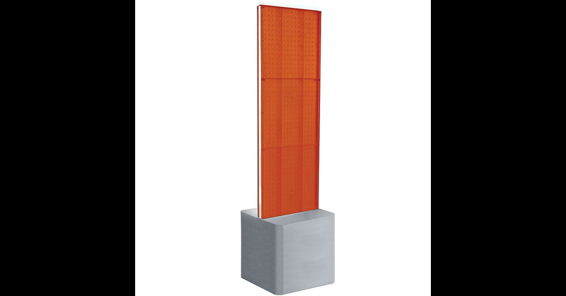 The sleek metal design of our ultramodern Studio Base will draw customer's attention to any product that is displayed. This display comes standard with a non-revolving rectangular silver metal base. See below for color panel and accessory options. Sign holder and wheels sold separately. Panel Size: 16"W x 60"H. Pegable Space: Between 44"H to 54"H. Base Size: 17"W x 14. 5"D x 16"H. Material: High Impact Styrene. Color: Two-Sided Pegboard Floor Display on Adjustable Studio Base. Panel Size: 16"W x 60"H.