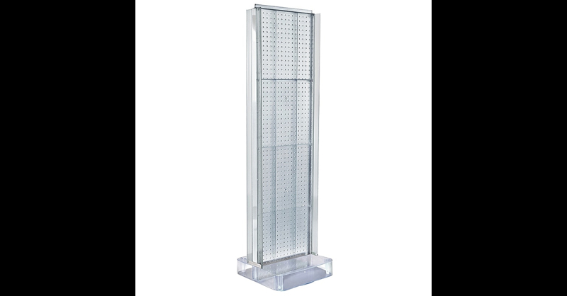 The sleek metal design of our ultramodern Studio Base will draw customer's attention to any product that is displayed. This display comes standard with a non-revolving squareplastic base. See below for color panel and accessory options. Sign holder and wheels sold separately. Panel Size: 16"W x 60"H. C-Channel Size: 5"W x 56"H. Base Size: 17"W x 4"H. Material: High Impact Styrene. Color: Clear. Two-Sided Pegboard Floor Display w/ C-Channel Sides on Studio Base. Panel Size: 16"W x 60"H.