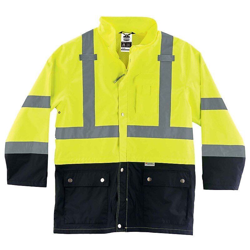 Class 3 Black Front Rain Jacket: Breathable poly shell keeps the rain out while lettering perspiration escape and black accents hide dirt in high wear areas. Breathable poly shell keeps the rain out while lettering perspiration escape. Black accents hide dirt in high wear areas. Weatherproof 300D oxford outer shell. Breathable PU coating, polyester mesh lining. 2 in ANSI-compliant 3M Scotchlite Reflective. Pockets: 2 front and cell phone. YKK #5 zippers. Dual mic tabs. Black accents on front and sleeve high wear areas. Size:.