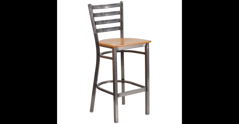 Commercial furniture needs to be both durable and low maintenance so metal barstools are a popular choice for furnishing restaurants, pool halls, lounges, bars and other high traffic establishments. This stool is easy to clean, which is an important aspect when it comes to a business. Built to withstand the everyday hustle and bustle in the restaurant and hospitality business, these dining stools will also look great in your home. The beautiful wood seat and ladder back design will keep guests comfortable. The frame is stabilized using two welded support bars, which includes a footrest to prevent leg discomfort. The floor glides help protect your floors and ensure smooth gliding. Use this bar height stool in your kitchen, dining room or home bar and give your decor a fresh look. The simple and lightweight design of this stool will not disappoint, whether used in the home or your commercial business. Metal Restaurant Barstools. Color: Natural Wood Seat/Clear Coated Metal Frame; Material: Plywood, Overall Dimensions: 17"W x 18"D x 42. 25"H. Seat Dimensions: 28. 75"H x 16. 25"W x 16. 5"D. Back Dimensions: 15"W x 14. 25"H. Rated for up to 500 lbs Based on 6-8 Hours Use. Care Instructions: Clean product with water and dry cloth. Assembly Required. Meets or Exceeds ANSI/BIFMA Standards; Rated for Commercial Use. Warranty: 5 Years Limited. Metal Dining Bar Chair for High Traffic Businesses. 500 lb. Weight Capacity. Ladder Back Design with Curved High Back for comfort. 625" Thick Plywood Seat is easy to clean. Welded Joint Assembly with Two Curved Support Bars. Footrest promotes better sitting experience. 18 Gauge Steel Frame Powder Coated Frame Finish. Floor Protector Plastic Glides. Designed for Commercial Use; Suitable for Home Use. Multi-use: kitchen dining chair, restaurant chair, side chair, caf chair, bistro chair. Run an efficient business with easy to clean restaurant bar stools that look great and are heavy duty for everyday use.