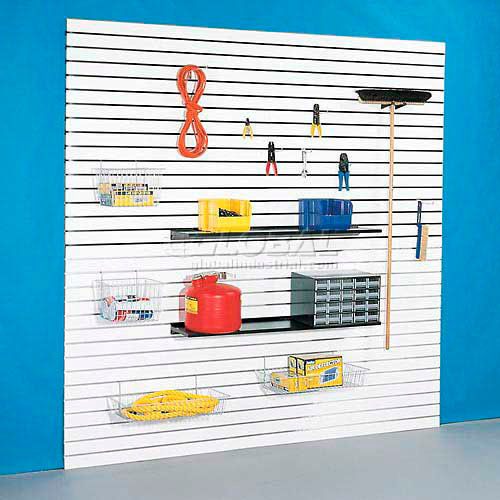 96"H x 48"W Slatwall Panel - Cherry Laminate, With Aluminum Inserts Modular Slatwall is completely flexible and allows for configurations to be quickly changed based on your needs. Use in many working environments such as storage closets, maintenance areas. Eliminates clutter and mess. Hang tools, mops, rakes, shovels, or any other items you need accessibility to. Slatwall panel is constructed of 3/4" medium-density fiberboard with cherry melamine surface with grooves on 3" centers. Optional accessories to maximize usage include: wire baskets (for small parts or tools), shelves, peg hooks for hanging tools, cords or rope, etc., chrome shelf brackets. Panels and shelves sold in package quantities. Slatwall panels are custom cut and not returnable. - Pkg Qty 4.