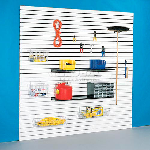 Modular Slatwall is completely flexible and allows for configurations to be quickly changed based on your needs. Use in many working environments such as storage closets, maintenance areas. Eliminates clutter and mess. Hang tools, mops, rakes, shovels, or any other items you need accessibility to. Slatwall panel is constructed of 3/4" medium-density fiberboard with white melamine surface with grooves on 3" centers. Optional accessories to maximize usage include: wire baskets (for small parts or tools), shelves, peg hooks for hanging tools, cords or rope, etc., chrome shelf brackets. Panels and shelves sold in package quantities. Slatwall panels are custom cut and not returnable. - Pkg Qty 4.
