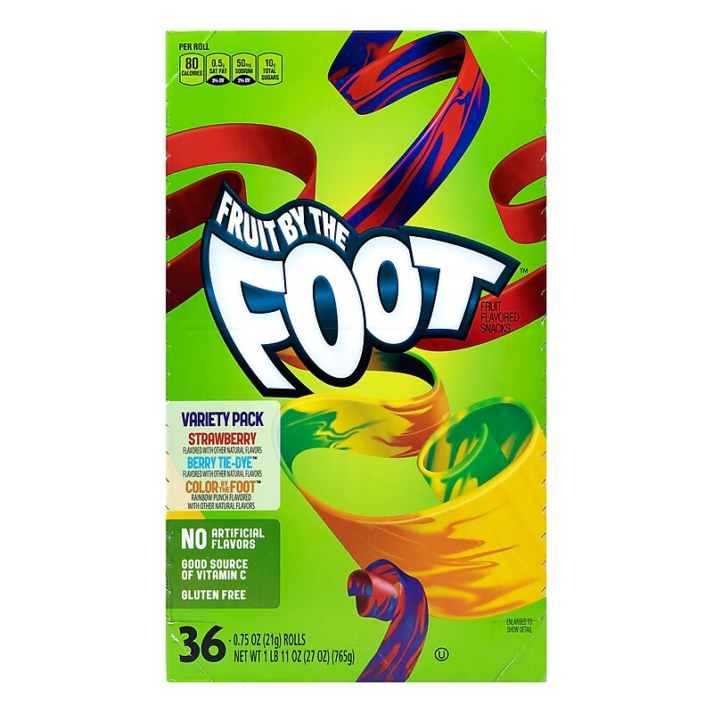 Fruit By The Foot Variety Pack, 0. 75 oz, 36 Count. Three different flavors with Strawberry, Berry Tie-Dye and Color by the Foot. Naturally Flavored. Gluten Free. A Good Source of Vitamin C. Individually Wrapped.