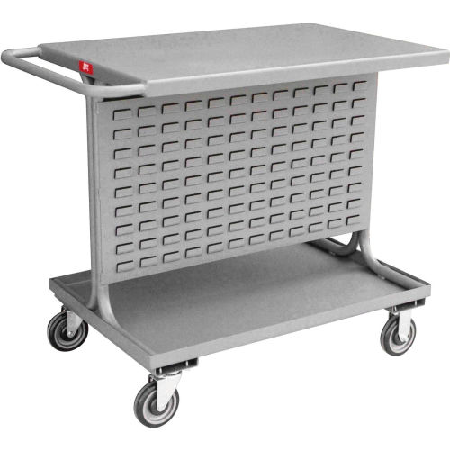 ALL WELDED STEEL MOBILE DOUBLE SIDED BIN RACKS 35"H Bin Rack with Top Shelf 5" Urethane Casters Mobile bin racks conveniently transport parts & supplies where you need them Bin racks are made of all welded 12 gauge steel that withstands up to 1,200 lb. capacity. Double sided louvered panels accept plastic hanging bins (sold separately) of any size. Includes tubular steel handle with comfort grips for easy maneuvering. Mobile bin racks include a tray bottom shelf for additional storage. 12 gauge steel casters mounts include 2 rigid, 2 swivel bolt-on casters for easy mobility. Bin Rack with Top Shelf features a flush top shelf to provide a convenient work surface that converts this bin rack to a mobile service cart. Click Here to check out our selection of Premium Stacking Bins.