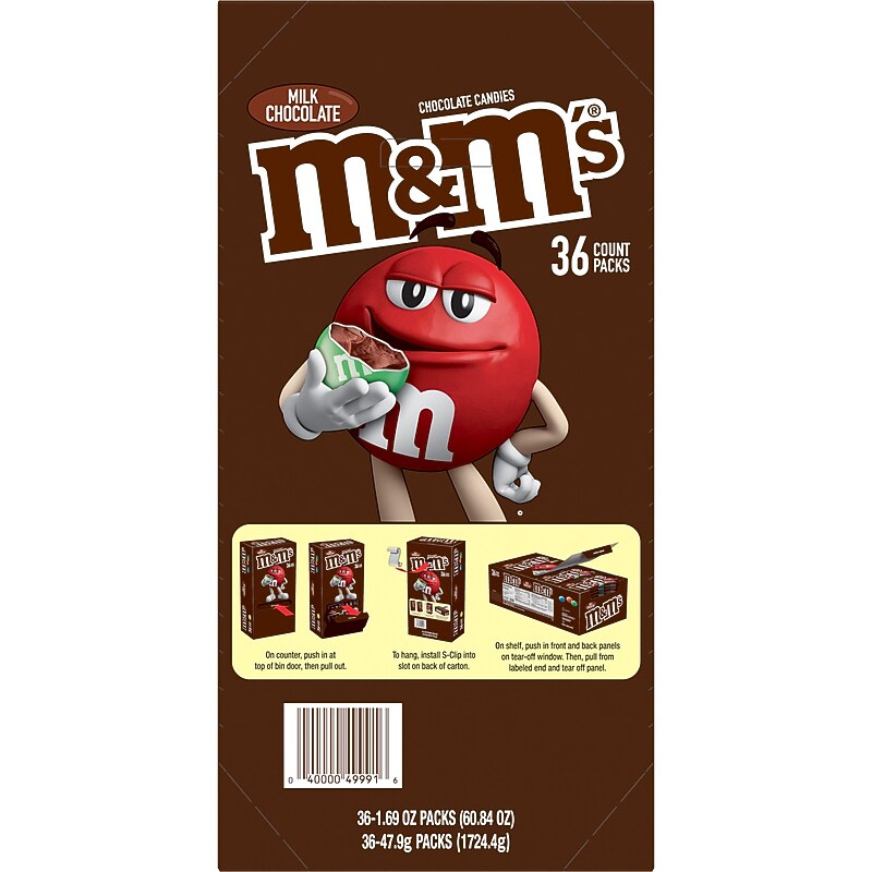 Satisfy your sweet tooth with these milk chocolate M&M's. With 36 bags in each box, these milk chocolate M&M's are perfect for handing out to large groups or stockpiling in your office pantry. M&M'S Milk Chocolate Candy. 1. 69-oz/pack, 36 packs/box. Bulk box of individually wrapped single size M&M'S Milk Chocolate candy. Great addition to the office breakroom. Bulk box can be used as a tabletop dispenser. Fill office vending machines or stock your pantry with the satisfaction of M&M'S Full Size Chocolate Candy.