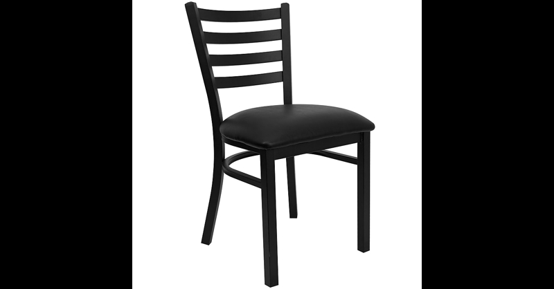 Commercial furniture needs to be durable and low maintenance so metal chairs are a popular choice for furnishing restaurants, pool halls, lounges, bars and other high traffic establishments. This upholstered chair is easy to clean, which is an important aspect when it comes to a business. Built to withstand the everyday hustle and bustle in the restaurant and hospitality business, these dining chairs will also look great in your home. The thick, foam padded seat and ladder back design will keep guests comfortable. The frame is stabilized using a welded support bar, while the floor glides help protect your floors and ensure smooth gliding. Use this chair in your kitchen or dining room to give your decor a fresh look. The simple and lightweight design of this chair will not disappoint, whether used in the home or your commercial business. Metal Dining Chair for High Traffic Businesses. Color:Vinyl Seat/Black Metal Frame; Material: Foam, Plywood, Steel, Vinyl. Overall Dimensions: 16. 5"W x 17"D x 32. 25"H. Seat Dimensions: 19. 5"H x 16. 75"W x 16. 25"D. Back Dimensions: 15"W x 12"H. Rated for up to 500 lbs. Based on 6-8 Hours Use. Assembly Required. Meets or Exceeds ANSI/BIFMA Standards; Rated for Commercial Use. Warranty: 5 Years Limited. Ladder Back Design with Curved High Back for comfort. 2. 5" Thick Foam Padded Seat with CAL 117 Fire Retardant Foam. Welded Joint Assembly with Curved Support Bar. 18 Gauge Steel Frame Powder Coated Frame Finish. Floor Protector Plastic Glides. Designed for Commercial Use; Suitable for Home Use. Multi-use: kitchen dining chair, restaurant chair, side chair, caf chair, bistro chair. Run an efficient business with easy to clean restaurant chairs that look great and are heavy duty for everyday use.