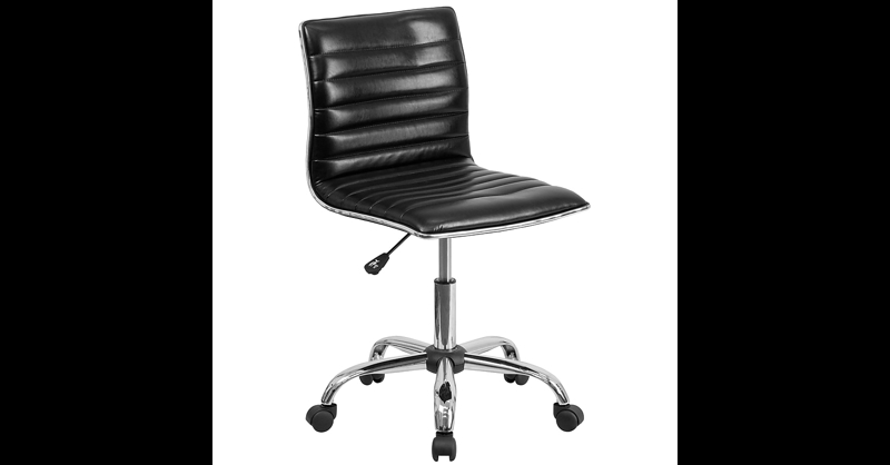 Modern accents and a sleek profile make this ribbed office task chair a perfect addition to your office. A streamlined silhouette combined with the armless design can breathe new life into a small workspace and not only allows room for more board members, clients or visitors but also permits you to roll further under a desk or table. The glossyvinyl upholstery with a chrome metal border paired with a matching chrome frame and base gives an up-market feel to any professional space. The low back design and foam molded seat and back provide lower back support. A pneumatic seat height adjustment lever lets you easily position the chair while the 360 swivel gives you access to all of your work surfaces. This sturdy task chair has a heavy duty, 5-star chrome base with dual-wheel casters. Spills clean up easily with water followed by a dry cloth. Vinyl Task Office Chairs. Color: Black Vinyl/Chrome Frame; Material: Chrome, Foam, Metal, Plastic, Vinyl. Overall Dimensions: 18"W x 21. 5"D x 31. 25" - 36"H. Seat Dimensions: 18" - 23"H x 17. 5"W x 16"D. Back Dimensions: 17. 5"W x 14. 5"H. Armless Design. Rated for up to 250 lbs Based on 6-8 Hours Use. Care Instructions: WD-Water and dry cloth. Assembly Required. ANSI/BIFMA compliant for safety. Warranty: 1 Year Limited. Contemporary Office Task Chair adapts to home or office spaces. Ribbed Black Vinyl Upholstery with Chrome Metal Accent Border. Molded Back and Seat featuring CAL 117 Fire Retardant Foam. Low Back Design provides support to the lower back region. Pneumatic Seat Height Adjustment accommodates multiple users. 360 Degree Swivel Seat allows you to reach multiple work surfaces. 5-Star Chrome Base with Dual-Wheel Casters provide smooth movement. Cleans Easily with water and a dry cloth. When you have a list of projects piling up on your desk, you need a chair that'll keep up with you. . insert your new Vinyl Task Office Chair.