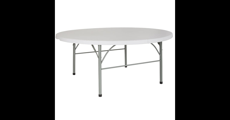 Say hello to the perfect solution for your seating crisis! The bi-fold round dining folding table is a great option for special event planners, catering companies and banquet facilities. This durable, easy to clean table is commercial rated for use in banquet halls, convention centers and at trade shows. Use during game night, dress it up for holiday parties, and coordinate crafts night. Thetabletop is 6' in diameter, 2" thick, and will comfortably seat up to 8 adults. Its waterproof, impact and stain resistant top have a 771 pound static load capacity. Attractive gray powder coated legs lock securely in place while in use and non-marring floor caps protect your floor by sliding smoothly when you need to move the table. The table folds in half, making it easy to store and transport, using the convenient carrying handle attached on the side. When using for outdoor events store indoors to protect the frame from extreme moisture. Round Plastic Folding Tables. Color: Granite White; Material: Metal, Plastic, Plastic: Polyethylene. Seats up to 8 Adults. Overall Dimensions: 71"Dia 29"H; Shape: Round. Weight Capacity: 771 lbs. Evenly Distributed. Meets or Exceeds ANSI/BIFMA Standards; Rated for Commercial Use. Fully Assembled. Ready To Use Commercial Table. 6' Folding Table. 2" Thick Granite White Top is waterproof, impact and stain resistant. Folds in half for storage and travel. Includes convenient carrying handle. Gray Powder Coated Locking Legs with protective floor caps. Legs fold underneath top for flat storage. No Assembly Required; Designed for Indoor and Outdoor Use. Warranty: 1 Year Limited. Folding tables offer versatility as tables for holidays and parties or for the event facility to setup beautiful arrangements.