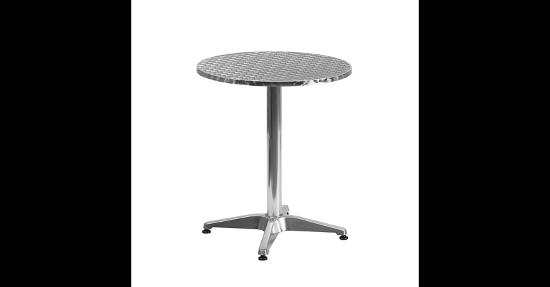 Whether you need to add more seating space or create an intimate conversation area, this versatile round table is up to the task. Enhance the look of your bistro, cafe, restaurant, hotel or home patio space without taking up too much real estate. The designer style stainless steel table top features a smooth surface for keeping items level. The column and base are constructed of lightweight aluminum material making it easy to move this table wherever you need it. Designed for all-weather use, this table is a great option for indoor and outdoor settings. For longevity, care should be taken to protect from long periods of wet weather. Whether you are just starting your business or upgrading your furniture this table is a wise investment. Aluminum Patio Table. Overall Dimensions: 23. 5"W x 23. 5"D x 27. 5"H. Color: Aluminum; Material: Aluminum, Plastic, Stainless Steel. Round Patio Table for Restaurants, Banquet Halls and Dining Room. Seating for 2 people. Smooth Stainless Steel Table Top. Aluminum Column and Base. Base Size: 23. 5"W. Plastic Floor Glides protect floor while indoors. Lightweight to move easily. Designed for Commercial and Residential Use. Outdoor dining table for sunroom, balcony, deck, patio or poolside. Furnish your patio or deck with an aluminum patio table that will remain a constant in design.