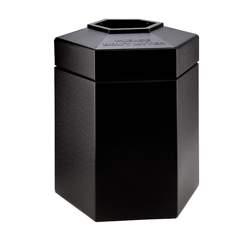 The PolyTec Series 45 Gallon Hex Waste Container has a unique, stream lined appearance that offers a larger capacity and convenient ease of use. The patented Grab Bag system secures the trash bag in place for a cleaner appearance with a decreased chance of the lid blowing off. These heavy duty waste containers are designed to withstand the harshest environments as well as offer easy maintenance. Environmentally friendly containers are molded from long-lasting recycled polyethylene. They won't rust, dent or chip. Large capacity, indoor or outdoor, hexagonal waste container. 31" (h) x 25" (w) x 22" (d). 45 gallon. Constructed from long lasting recycled polyethylene that won't fade, rust or chip and is graffiti-resistant. Open top offers convenient disposal. Patented Grab Bag system keeps trash bag secure and prevents slippage. ADA Compliant. Made in USA. 45 gal.