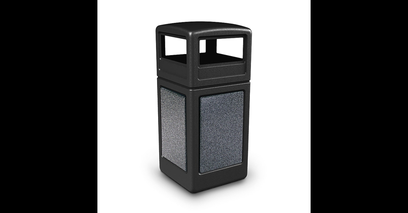 Thewith pepperstone panels, gallon square StoneTec trash receptacle with dome lid has a stream-lined, contemporary style offering large capacity and convenient ease-of-use. The dome-shaped lid discourages the placement of garbage on top of the unit and prevents rainwater, snow and sleet from collecting in the waste container. The waste container panels are constructed of polymer concrete to withstand extreme climates while also maintaining their beautiful aesthetic . The innovative snap lid closure and patented Grab Bag system secure the trash bag in place for a cleaner appearance with a decreased chance of the lid blowing off. These heavy-duty waste containers are designed to withstand the harshest environments as well as offer easy maintenance. These environmentally friendly containers are molded from long-lasting recycled polyethylene. They won't rust, dent or chip. Large capacity, StoneTec paneled, indoor or outdoor trash receptacle with dome lid. 41. 75" (h) x 18. 5" (w) x 18. 5" (d). gallon. Constructed from long lasting recycled polyethylene with polymer concrete stone panels. It won't fade, rust or chip and is graffiti-resistant. Covered dome lid protects it from the weather. Patented Grab Bag system keeps trash bag secure and prevents slippage. ADA compliant. Made in USA. Assembly is required for the StoneTec panels. gal.