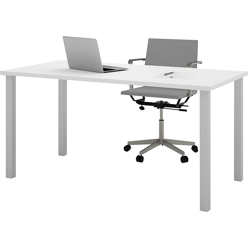 The Bestar tables with metal legs can fit in any room and adapt to many uses. Square metal legs in gloss silver finish. Tabletop finish: The sleek, zinc-finish metal legs are equipped with leg levelers, allowing you to adjust the height of each leg to adapt to any floor irregularities. Overall dimensions: 29"H 60"W 30"D. Weight: 32 lbs. Sleek, low-profile work surface. ⚠ WARNING: This product can expose you to chemicals including formaldehyde, wich is known to the State of California to cause cancer or birth defects or other reproductive harm. For more information, go to www. p65warnings. ca. gov/furniture.