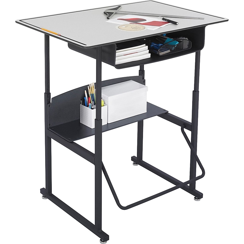 Safco AlphaBetter Desk with Book Box. Phenolic (laminated plastic) desktops are durable and chemical, fire and impact resistant. 42"H x 36"W x 24"D. Steel frame with black powder coat finish for durability,premium top. Desk adjusts from to high; adjustable in 1 " increments. Desk designed for students in grades 3-12. Lower shelf provides additional storage for supplies and books. Patented Swinging Pendulum Footrest Bar allows natural movement while standing at desk. Includes additional book box. Patent nos. 8061278 and 8291833.