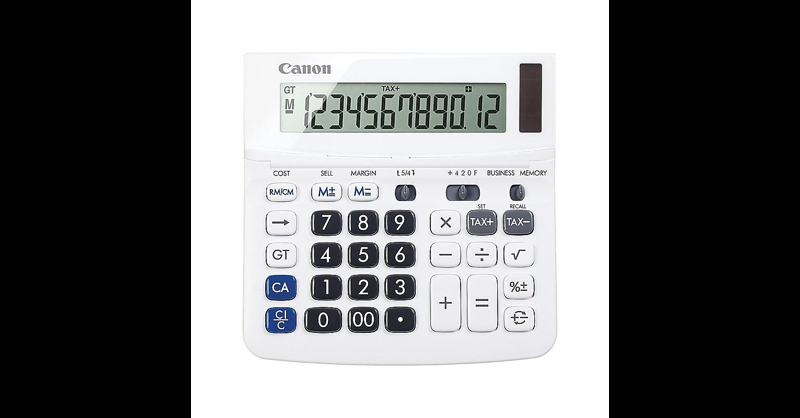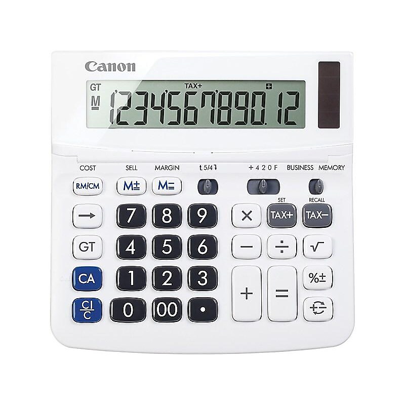 Keep your desk ready for business math and accounting tasks with this portable calculator. Cost, sell, and margin functions, along with a collection of decimal options, make it easy to choose the right setting for every task. A large display ensures numbers are easy to read, while the color-coded buttons allow for effortless operation. With a compact size, this Canon calculator tucks away in a desk drawer for convenient storage. Desktop calculator offers 12-digit LCD display for convenient viewing. Easy-to-use solution for all of your basic math needs. Can be operated from solar power or battery, so you can use it both day and night. Tax calculation function makes financial calculations streamlined. Decimal switch, rounding switch, square root, percent, sign change, and grand total functions to solve many additional mathematical problems. Auto power-off feature prevents unwanted or unintentional use of the battery. Angled display is easy on the eyes. Made from plastic. Comes Dimensions measure: 6. 5"W x 6"D x 1. 25"H. 1-year manufacturer limited warranty. Find solutions to basic math problems with this Canon portable display calculator.