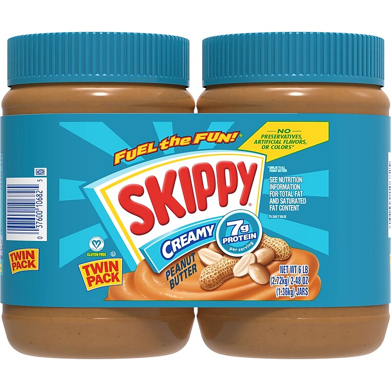 Add a delicious touch to snacks with this peanut butter. With a smooth, creamy texture, this peanut butter makes it easy to spread on bread, crackers and other foods. This Skippy creamy peanut butter comes with two in a pack, so you can make sure to have plenty on hand for large recipes, making multiple lunches and other peanut butter needs. Smooth, creamy, delicious taste peanut butter made with real roasted peanuts. Each jar is oz. Two jars per pack. The product is a good source of vitamin E and is gluten-free. No preservatives, artificial flavors, or colors. 0. 25 oz. protein per serving. Allergy warning: the product contains peanuts. Make sandwiches, sweet treats, and other foods with this 2-pack of Skippy creamy peanut butter.