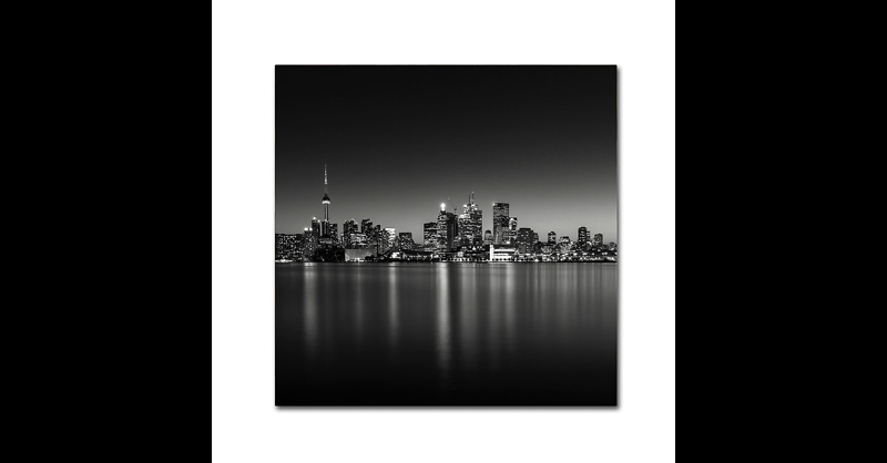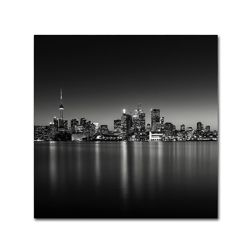 This ready to hang, gallery-wrapped art piece features a black and white photograph of a city skyline at night. Dave MacVicar is a Canadian photography who resides in Toronto, Canada. His traditional photographs were replaced by long exposure black and w hite images that covey a tranquil yet somewhat brooding feel. Dave is also been focusing on abstract architecture photographs in addition to his landscape and seascape work. Giclee Print. Frame Type: No Frame. Dimensions: 14 x 14. Artist: Dave MacVicar.