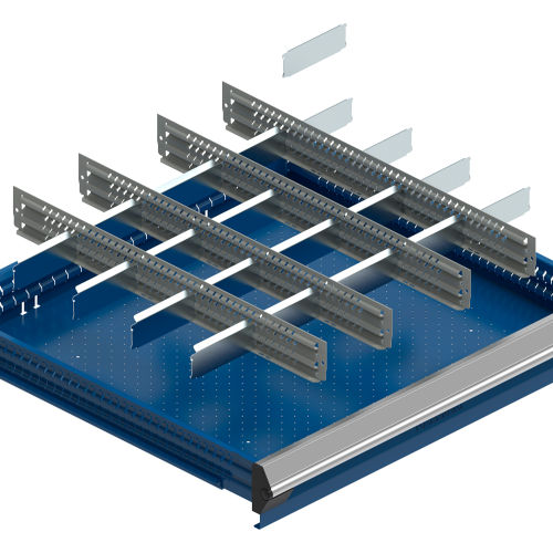 Divider and Partition Kits for Modular Drawer Cabinets Includes Dividers that divide drawers lengthwise and Partitions that divide drawers widthwise. Great for compartmentalizing drawers for small parts storage. Dividers have a 45 angle at top for easy retrieval and identification of parts. Dividers are adjustable on 1/2" centers and Partitions on 1" centers. Dividers and Partitions are locked into place by a clip system. Gray color. Nominal Outside Drawer Size: 48"W x 24"DInside Drawer Dimensions: 44"W x 21"D8" Drawer Face Height7" Usable Height.