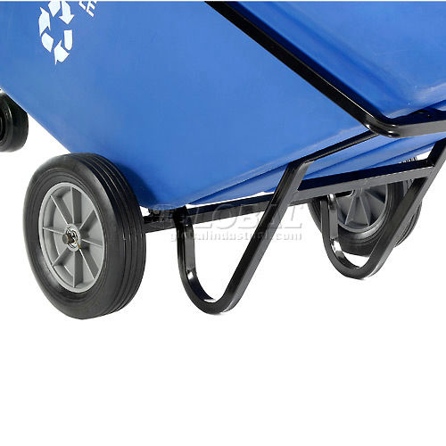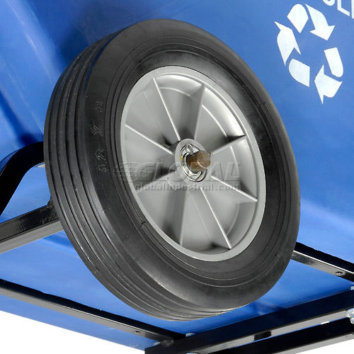 Ruggedly built for collection, transporting and dumping bulk recycling products and waste. This recycling tilt truck is ideal for food service, retail and plant operations where bulk materials are collected. The one-piece seamless rotationally molded blue polyethylene dump truck body is easily cleaned, won't dent, rust or chip, and is leak-proof. Includes a white WE RECYCLE logo on both sides. Steel chassis provides maximum support. Convenient push handle, with trash bag hooks, and lift handle provide secure handling. Ships assembled. Heavy Duty Truck offers steel extended support rails to help prevent against bulging while under load, two 12" roller bearing mold-on rubber load wheels and two 5" rubber swivel casters for easy rolling of heavy loads.