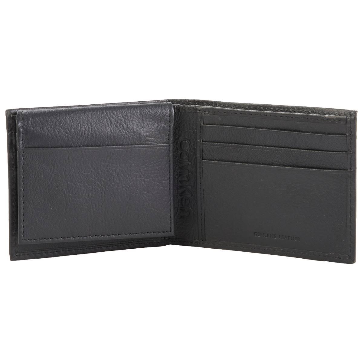 Pattern: Solid Embroidered "CK" text Technical lining helps shield your cards from data theft Clear ID window "Calvin Klein, Genuine Leather" text inside Multiple card slots Full bill compartment.