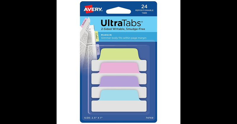 Avery Margin Ultra Tabs offer a narrow body that fits within the margins of books, notebooks and printed documents without interfering with text. This makes indexing, flagging and referencing documents quick and easy. The durable tabs are writable on both sides and the adhesive body is clear so you can see text underneath. You can write on these page tabs with most pens, pencils, markers and highlighters, and they're smudge free. * These repositionable tabs stick securely, but remove easily without leaving any residue or lifting ink. Perfect for home organization; use these sticky tabs as page flags in magazines, bible tabs for passages or index tabs in cookbooks. Students, teachers and administrators will find it easy to highlight textbooks and notes without marking the pages. At the office, make quick and easy sticky notes in your weekly or monthly planner and mark items in a report or presentation for referencing, follow up or signatures. The pack of 24 pastel color tabs includes 6 6 pink, 6 purple and 6 green 2. 5" x 1" tabs. *Ink dry times may vary. Tab may lift some inks. Test before applying. Mark pages with no interference; the tabs narrow body fits within margins of books, notebooks and documents. Easily view text or graphics underneath the clear body of the ultra tab. Sturdy and durable, these page tabs provide a strong enough hold to turn pages without worry of falling off. Reuse and re-stick multiple times; repositionable adhesive makes these sticky tabs removable for quick changes. Handwrite on both sides of the 2-sided writable tab. Get crisp and clear writing on the smudge-resistant* tab when using most pens, pencils, markers and highlighters. Perfect for home, office and school; Avery Ultra Tabs make great bible tabs, journal tabs, report tabs and notebook tabs. Pack of 6 6 pink, 6 purple and 6 green pastel color tabs. Avery Ultra Tabs are perfect office, school and home solution for organizing documents, marking planners, indexing files, color coding notes and more!.