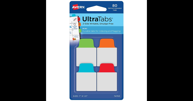 Avery Mini Ultra Tabs are durable tabs that make indexing, flagging and referencing documents quick and easy with a smaller size that won't get in the way of text or each other. The page tabs are writable on both sides and the clear adhesive body does not interfere with any text or graphics underneath. Get crisp and clear writing on the smudge free* page markers with most pens, pencils, markers and highlighters. These repositionable tabs can stick securely, but remove easily for multiple uses. Perfect for home organization; use these sticky tabs as page flags in magazines, bible tabs for passages or index tabs in cookbooks. Students, teachers and administrators will find it easy to highlight textbooks and notes without marking the pages. At the office, make quick and easy sticky notes in your weekly or monthly planner and mark items in a report or presentation for referencing, follow up or signatures. The pack of 40 colored tabs includes 20 red, 20 blue, 20 orange and 20 green 1. 5" tabs. *Ink dry times may vary. Tab may lift some inks. Test before applying. Get more out of organizing, referencing and color coding with mini tabs; the smaller size allows you to fit more tabs in your books, planners and notes. Easily view text or graphics underneath the clear body of the ultra tab. Sturdy and durable, these page tabs provide a strong enough hold to turn pages without worry of falling off. Reuse and re-stick multiple times; repositionable adhesive makes these sticky tabs removable for quick changes. Handwrite on both sides of the 2-sided writable tab. Colors: Blue, Green, Orange, Red. Get crisp and clear writing on the smudge-resistant* tab when using most pens, pencils, markers and highlighters. Perfect for home, office and school; Avery Ultra Tabs make great bible tabs, journal tabs, report tabs and notebook tabs. Pack of 20 red, 20 blue, 20 orange and 20 green color tabs. Avery Ultra Tabs are perfect office, school and home solution for organizing documents, marking planners, indexing files, color coding notes and more!.