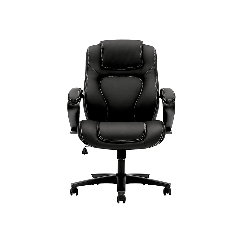 Durable vinyl upholstery, a waterfall seat edge and dramatic arms and base give this chair an upscale feel at a compelling price. Vinyl upholstery color isand base and frame are Black. Excellent for any organization seeking high performance on a limited budget. Frame and five-star base are contemporaryfinish. Durable vinyl upholstery resists spills; color is Black. Segmented, padded back design with contrast stitching offers an upscale look for any executive office or conference environment. A perfect solution for executive, professional, and conference workspaces. Fixed loop arms provide added comfort. Center-tilt mechanism rotates the seat from a point at the center to comfortably recline. Pneumatic seat height adjustment moves the seat up and down to adapt to various body heights. Tilt tension controls the rate and ease of recline. Upright tilt lock secures the chair in the full upright position. 360-degree swivel provides freedom of movement in any direction. Backed by the HON Limited 5-Year Warranty. Model Option: HVL402. EN11. This HON executive high-back chair has center-tilt with lock and tension control.