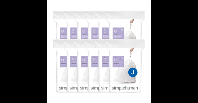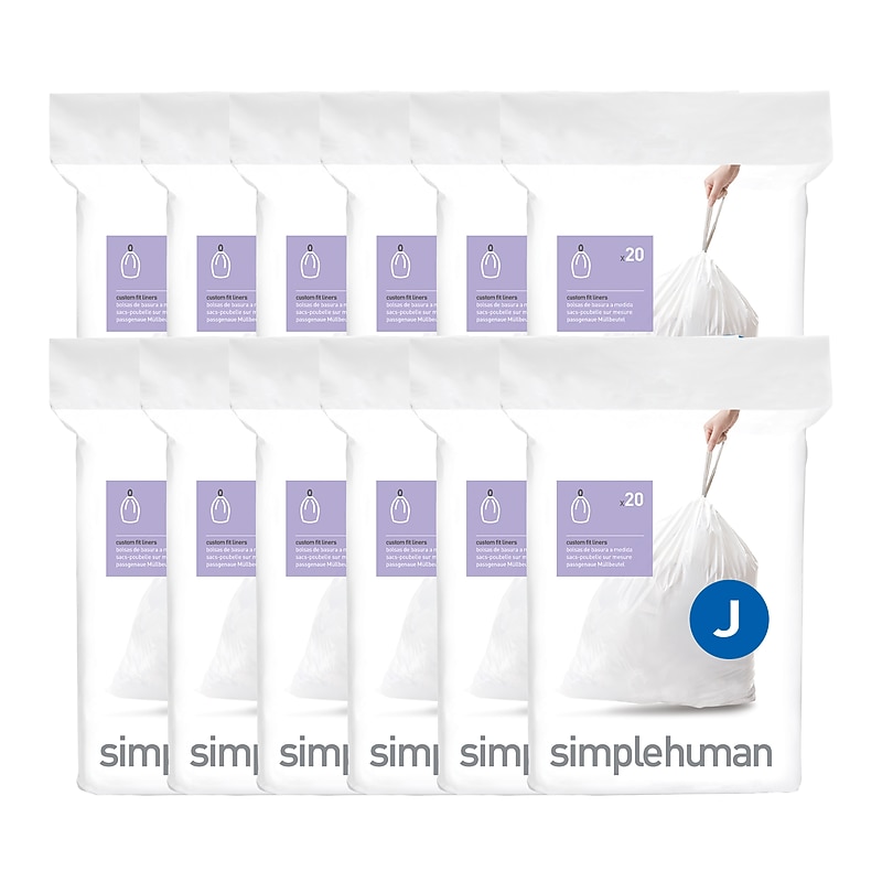 Install these custom-fit liners in your simplehuman trash can for a perfect, slip-proof fit. The custom liners are hidden when the lid is closed, and strong plastic and durable double seams prevent rips and tears, making it easy to take out the trash. Simplehuman code J liners have a capacity of 8 to gallons and come in four 60-count dispenser packs, so you can easily grab just one at a time. Get rid of trash while keeping garbage cans clean with these liners. Close even the fullest bags with one quick pull of the drawstring. Medium strength is great for kitchen trash and throughout the workplace. The gal. capacity is perfect for the kitchen or throughout the house. Capacity: 30-45 Liter/8-12 Gallon. Multiuse, strongplastic bags provide maximum puncture and tear resistance. 240 trash bags per box. The low-density plastic keeps heavy or wet trash from stretching holes in the bag. Get a perfect fit every time with these durable simplehuman code J custom-fit trash can liners.