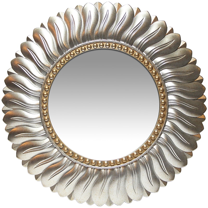 The beadedinner ring adds a touch of elegance, and surrounds an 11. 5" diameter mirror. Color/Material: Light Gold, Plastic. Dimensions: 21. 5 in H x 21. 5 in L x 2 in D. Actual Mirror Size: 11. 5 in. Keyhole hanging mechanism. 1 Year Limited Manufacturer Warranty. Decorative mirror for any home or office, measuring 21. 5" in diameter overall.