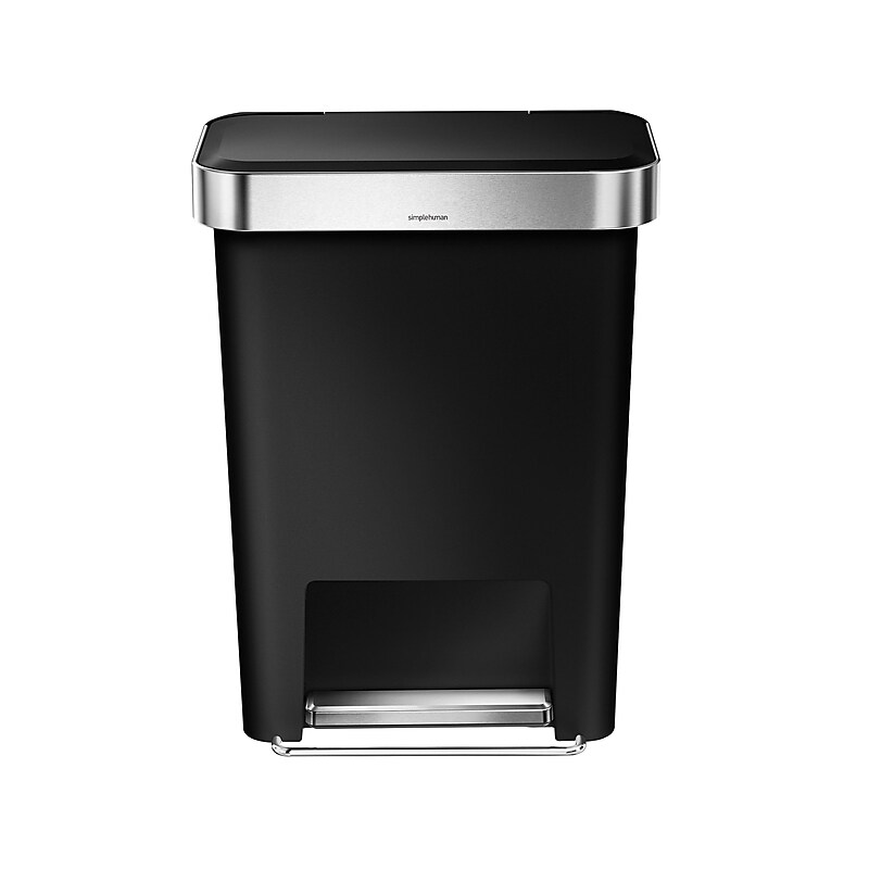 Innovative 'liner pocket' stores and dispenses liners from inside the can for a faster liner change. Liner rim grips and hides liner. Strong steel pedal and silent-close lid. Rectangular step can. Capacity - Gallons.Plastic. Dimensions - 18. 5"W x 12. 6"D x 25"H 34. 8" with lid open. Silent close lid - The simplehuman patented lid shox technology controls the motion of the lid for a slow, silent close. Neat and secure - Stainless steel liner rim flips up for a quick and easy liner change, then closes over the liner to hold it tightly in place and keep it hidden from sight. Stabilizer bar - Keeps the can steady for smooth and solid operation. Liner pocket - Keep liners where you need them. Dispense them one by one no perforations or unraveling from inside the can for a faster liner change. Internal hinge - Allows you to place this can right up against the wall. Custom fit liners - Code K liners are designed to fit this can perfectly and are extra strong to prevent leaks and tears. Refill packs dispense liners one at a time and store perfectly in cans with our new liner pocket feature. simplehuman designs tools that help people become more efficient at home.