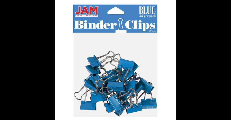 JAM Paper Designer Binder Clips will get you organized in style! These small size binder clips measure at 19mm and are perfect for organizing and clipping documents together. The movable metal handle can be left upright so you can hang them up, or folded flat for easy storage. These clips are very versatile so use them for more then just clipping papers together! Use them to organize wires or cords, hang them from bulletin boards, or use them as stands for small items. Theseclips are made from durable metal, have a smooth, shiny finish, and are sold in packs of 25. Small binder clips hold up to 0. 38" stack of paper. Blue made from a combination of sturdy metal & plastic. Pack includes 25 clips. The JAM Paper small 19mm binder clips is made of metal and has a shiny finish, which adds ingenuity to your clipping needs.