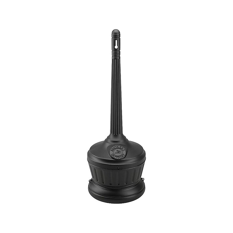 Provide customers and employees with a safe place to extinguish cigarettes with this receptacle. The wide base prevents tipping, and the extra-large 16-quart pail reduces the need for frequent emptying. This Smokers' Outpost cigarette bin has tie-down rings for increased security. Cigarette receptacle extinguishes cigarettes without sand or water. gal. pail liner. Made ofhigh-density polyethylene for long-lasting use. Dimensions: 42"H x 15. 38"W x 15. 38"D; round base. Patented oxygen-restricting design extinguishes cigarettes quickly with no sand or water needed. Meets or exceeds ADA, FM standards. Screw closure, tie-down rings, and optional bolting hardware make security simple. Keyhole opening discourages unwanted litter. 1-year manufacturer limited warranty. Keep your business free from cigarette waste with this Smokers' Outpost cigarette receptacle.