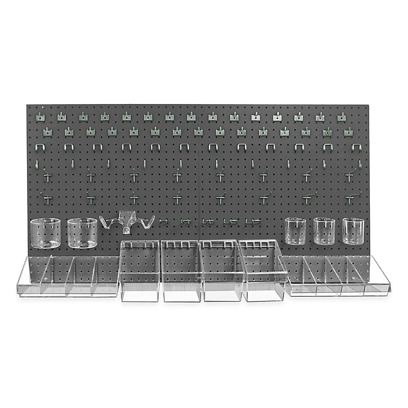 Pegboard 24 xOrganizer Kit contains 2 pegboard wall panels 24x24, screws, hooks, cups and bins that helps in organizing your supplies efficiently. It is suitable for use in dorm rooms, garages and craft rooms. Color & Material:Solid Injection Molded Plastic. Type: Organizer Kit. Use: Our Pegboard Organizer Kits are Perfect for Garages, Craft Rooms, & Dorm Rooms. Pack Size: Each. Includes: 2 Pegboard wall Panels, 2 Divider Bin Trays, 6 Dividers for Divider Bin Trays, 3 3" Dia. Cups, 2 4" Dia. Cups, 4 Small Display Bucket, 1 Open Eyeglass Holder, 10 Metal J-hooks & more. Features: These Kits Come with Pegboard Wall Panels, Hooks, Screws, Bins, Cups to hold & Organize Any Supplies in Your Home or Workplace. Pegboard 24 xOrganizer Kit - Includes pegboard wall panels, screws, hooks, cups and bins.