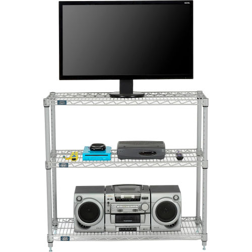 Nexelate Silver Epoxy (3) Shelf Media Stand, 36"W x 14"D x 34"H Includes three heavy duty, height adjustable Wire Shelves and four 1" dia. Posts with leveling feet. Open wire design permits more light and air circulation and resists dust build-up. Ideal for media components, retail display or long lasting storage. Shelves are adjustabel in 1" increments. No tools required; shelves are held in place with special designed friction clips. Nexelate is an attractive finish that consists of a Silver Epoxy powder-coat over a rust inhibiting undercoat. NSF approved for wet or dry use.