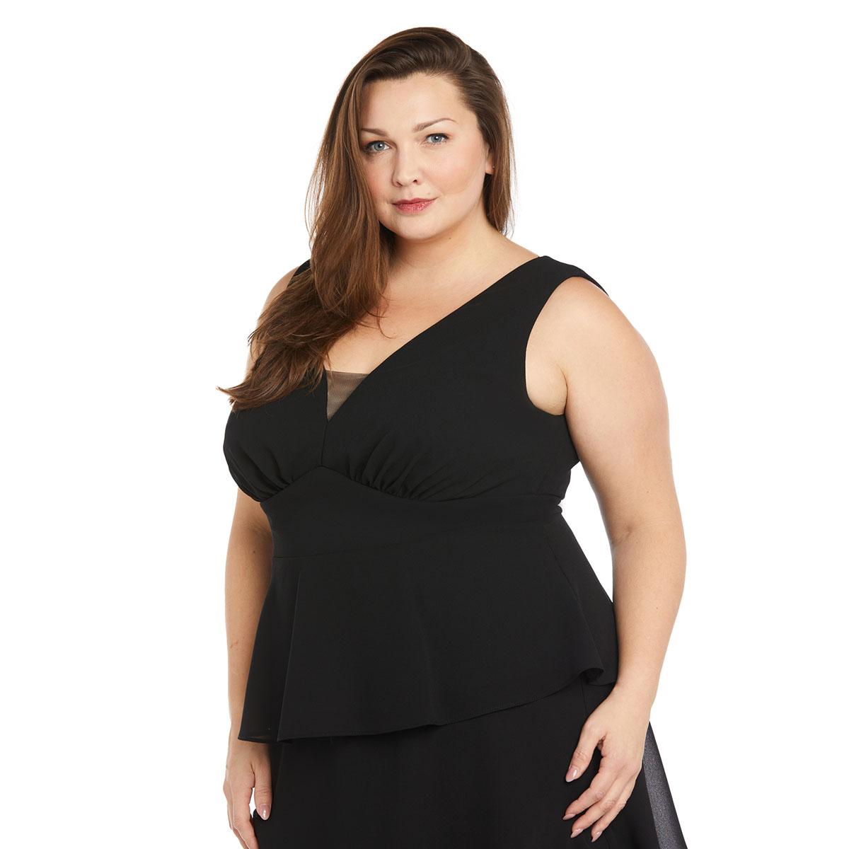 Pattern: Solid Sleeve Length: Sleeveless Neck: Plunge V-Neck Mesh neckline inlay Wide empire waist seaming Center back zip closure Pleated bust detail Tiered styling High side slit Fully-lined.