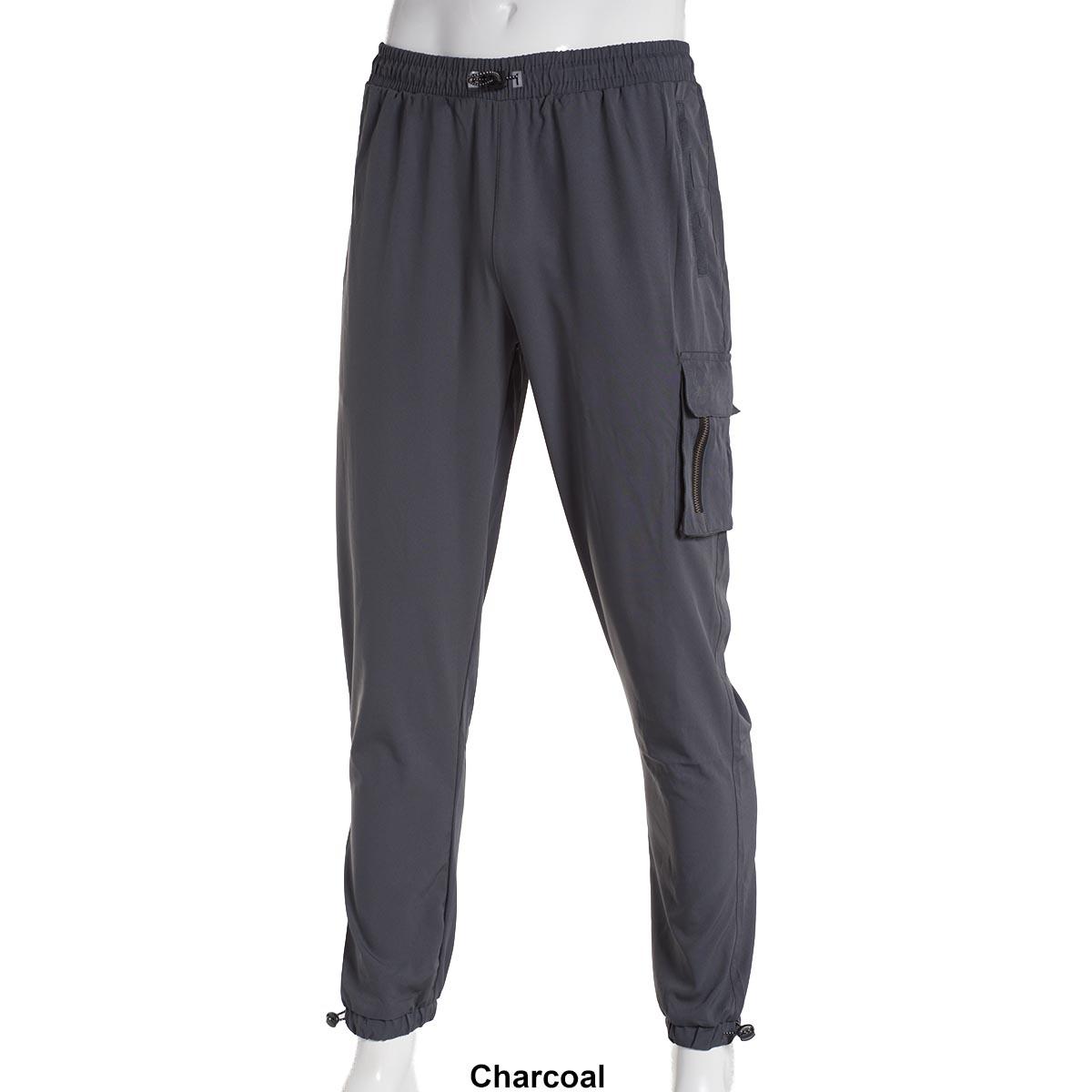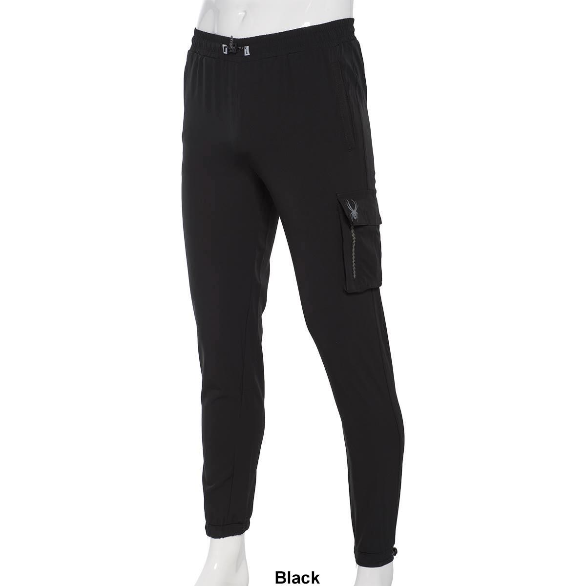 Update your active look and stay comfy at the same time with these Mens Spyder stretch woven joggers. Elastic waist with a functional drawstring 2 side pockets 1 cargo pocket with logo and zipper closure Elastic cuffs with a functional drawstring.