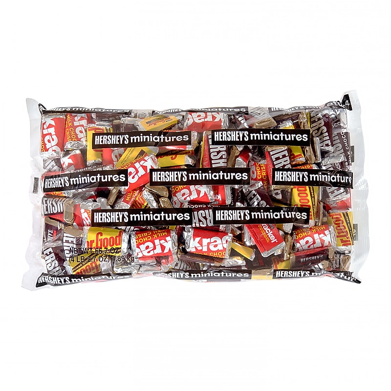 Keep this chocolate assortment bag on hand to satisfy a sugar craving in seconds. Hershey's Special Dark, Mr. Goodbar, Krackel and milk chocolate Hershey's bar are all included, so everyone gets to pick their favorite. The individually wrapped mini bars in this Hershey's assortment bag easily fit in bags, purses, and desk drawers, making it easy to grab one and go for a portable treat. Chocolate is a perfect addition to any dessert table. Everyday theme. Bulk wrapped candy simplifies shopping for snacks. 66. 7 oz. bag. Includes miniature versions of HERSHEY'S Milk Chocolate Bars, HERSHEY'S SPECIAL DARK Chocolate Bars, KRACKEL Chocolate Bars, and MR. GOODBAR Milk Chocolate Bars. 210 calories per serving. Product contains total fat (13 gram), saturated fat (7 gram), cholesterol (5mg), sodium (35mg), total carbohydrate (26 gram), dietary fiber (2 gram), sugars (22 gram), protein (3 gram), calcium, and iron. Individually wrapped candies allow everyone to grab as much as they want. Contains milk, soy, and peanuts. Cater to the sweet tooth of any chocolate fan with this 4. 1-pound Hershey's Miniatures assortment bag.