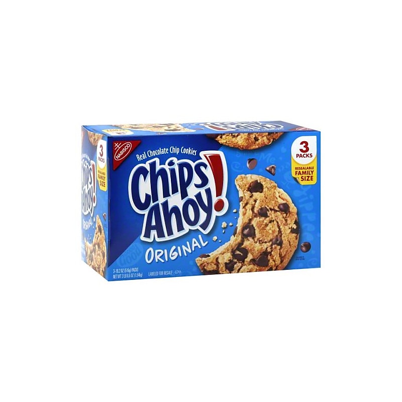 Nabisco Chips 54. 6 oz. Ahoy Cookies are great lunch box and daycare item. They are mouth-watering cookies and are made with real chocolate chips. Cookies are made with real chocolate chips to satisfy any sweet tooth. A resealable pack with easy-pull tab keeps cookies fresh and is perfect for snacking, sharing, or traveling. Includes 3 - 18. 2 Family Size packs of Chips Ahoy! Original Chocolate Chip Cookies. Nabisco Chips 54. 6 oz. Ahoy Cookies - Made with real chocolate chips.