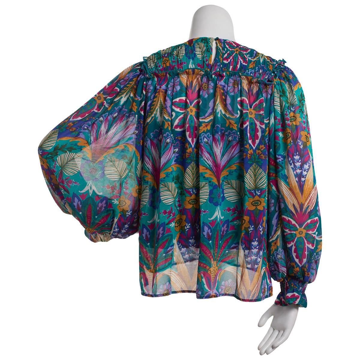 Pattern: Tropical Sleeve Length: Long Puff Sleeve Neck: Crew Neck Rear keyhole interlock Smocked cuffs with shirred trim Accordion pleated yoke Split side seams Ruffle seaming Fully-lined Linear hem Cool iron.
