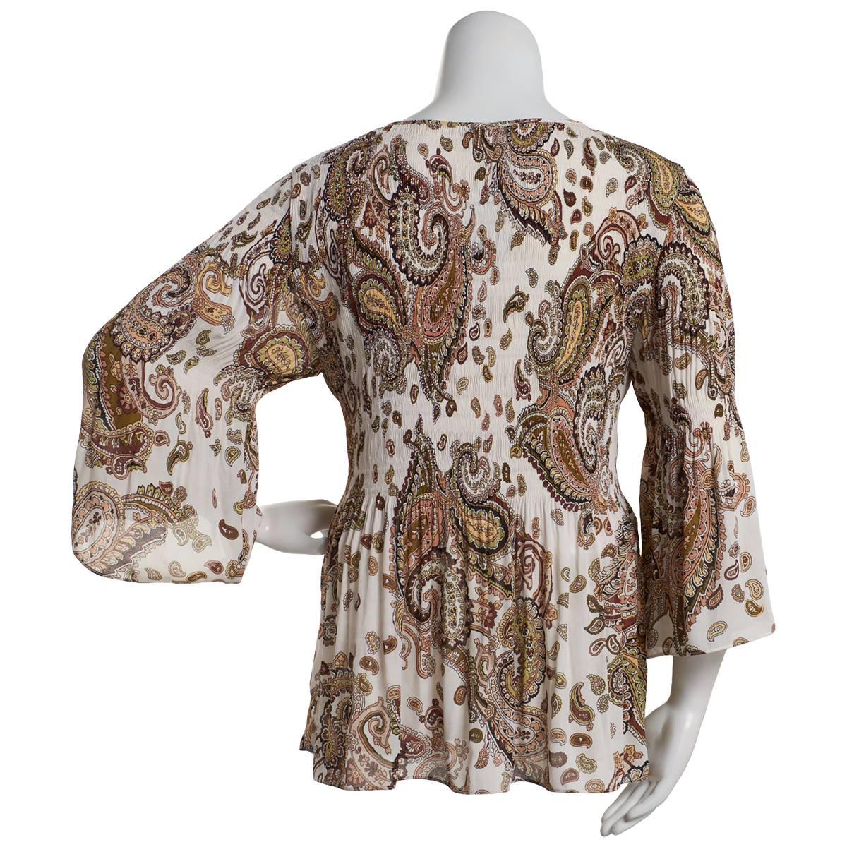 Pattern: Paisley Sleeve Length: 3/4 Bell Sleeve Neck: Keyhole Neck Smocked yoke & sleeve panel Cascading pleat detail Linear hemline Cool Iron.