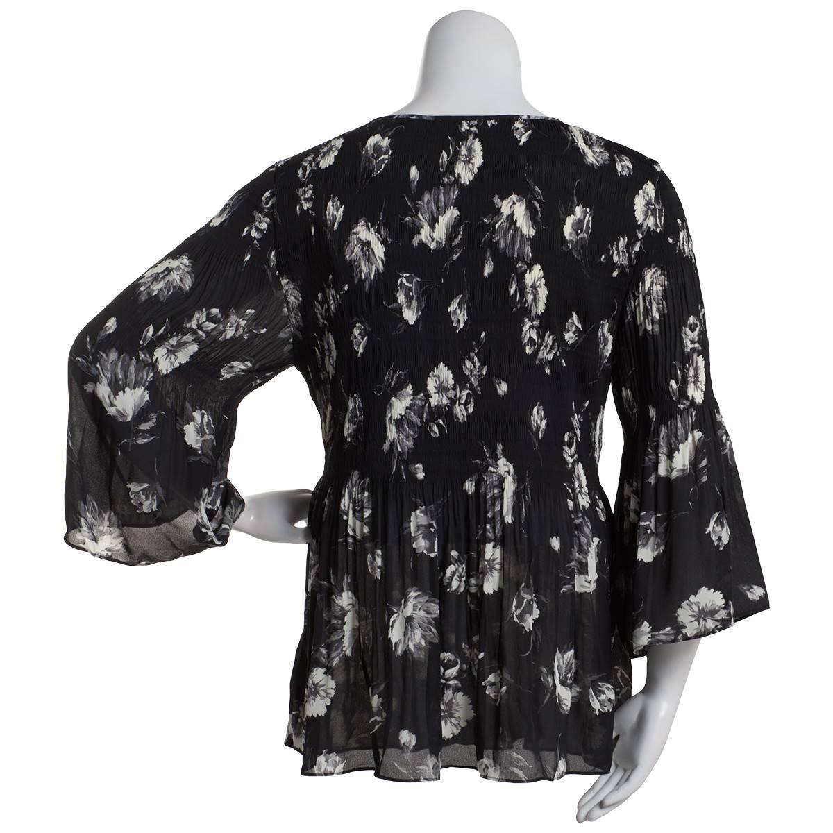 Pattern: Floral Sleeve Length: 3/4 Bell Sleeve Neck: Keyhole Neck Smocked yoke & sleeve panel Cascading pleat detail Linear hemline Cool Iron.