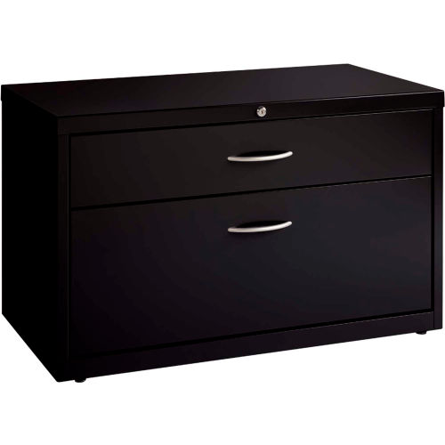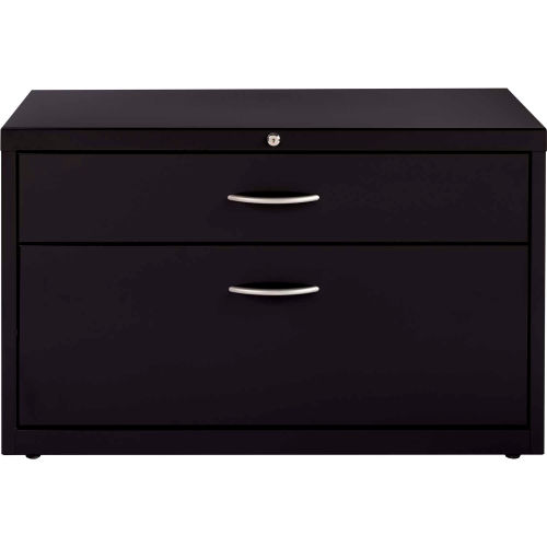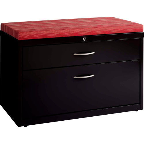 Interion By Global Industrial Low Credenza with File Cabinet - Black This 36 in. wide 2 drawer commercial grade credenza filing cabinet is designed for both storage and seating, and looks great in any office. The drawer configuration includes one file drawer and one smaller drawer to help organize desk and office supplies. This credenza makes the perfect storage companion for our Interion Open Desk System. Precision ball-bearing suspension allows for quiet use in your busy office environment. Fully welded steel construction with reinforced base. Interlock system prevents tipping by only allowing one drawer open at a time. Dual lock bars and core-removable lock come standard. Unit includes hang rails in file drawer, magnetic label holders, and four adjustable leveling glides. Greenguard Gold certified for indoor air quality. Meets or exceeds ANSI/BIFMA standards. TAA compliant. Limited Lifetime Warranty. Features: Commercial grade ball-bearing suspension allows fully loaded drawers to open with easeLock included to keep contents of all drawers secureDrawer dividers included in box drawerAccommodates letter, legal & A4 size hanging filesReinforced base constructionOptional Cushion (sold separately) can be used to create additional seating.