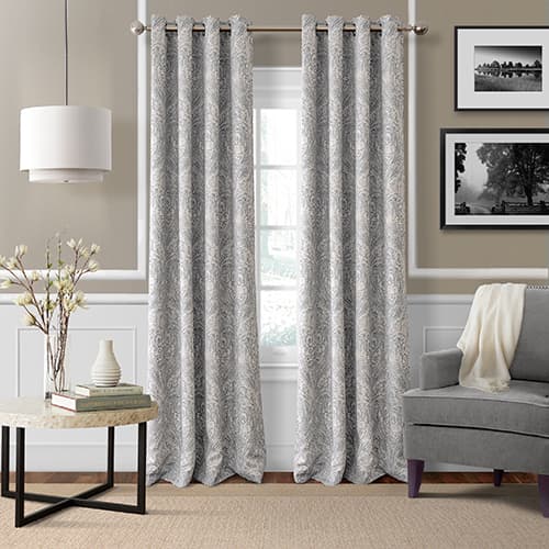 This Elrene Julianne room darkening curtain panel is energy efficient, helps keep light out, and reduces furniture fading. It also helps to keep heat and air conditioning in. The pretty vintage paisley pattern is printed on quality room darkening textured ground. Easy to hang with grommets. One panel per package. Shown: Two 84" panels.
