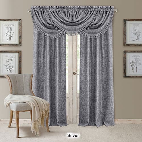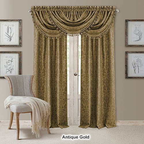 The Elrene Antonia blackout curtain panels showcase a timeless print design. These rod pocket curtains are energy efficient by keeping heat and air conditioning in, keeping light out, and reducing furniture fading. 100% Polyester. Machine wash cold on gentle with like colors. Tumble dry low. One panel per package. Shown: Two 108" panels and 3 waterfall valances.